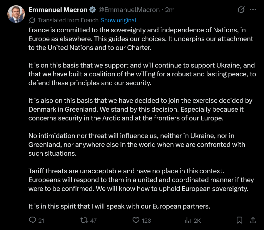 >>526255115Greenland is part of the Americas. It's on our continental shelf. It is not European ground. And publicizing troop movements to Greenland, however pathetic and unintimidating they are, is a show of force. That is, whether you want to admit it or not, where we are now.