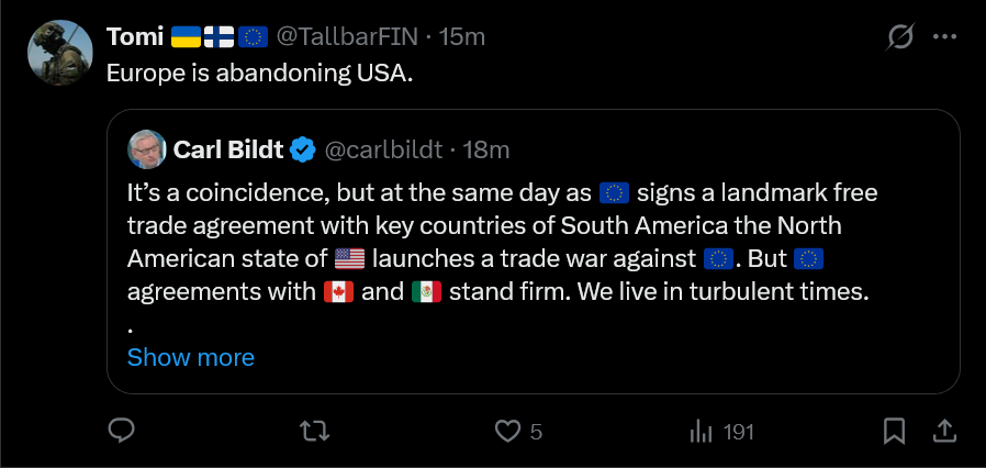 What was already happening but is now accelerated..Europe was trading more with China and when burgers decide to be salty, kick and scream on the floor while crying.. It will just make the transfer to import from China that much faster.Burgers just shot themselves in the foot but call it ((progress))