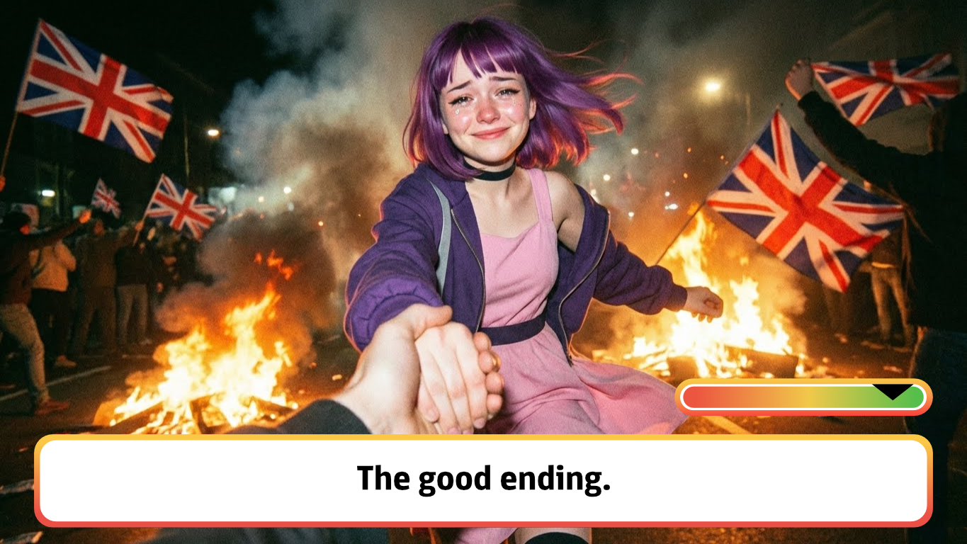 >>526254502>>526254988>brits make a "game" meant to tell kids that interacting with right wing content may be illegal>noticing or investigating for yourself is wrong and gives you warnings>ending is always being sent to reeducation>for some reason right wing is represented by an alt-girl who wants to redpill people about white replacement>internet interprets her as the good guy and the UK government as 1984 parallels are noticedIt's also a genuine ad for the government's reeducation program, Prevent UK