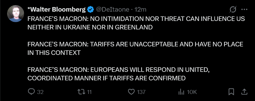 >Statement by French President Emmanuel Macron in response to today’s threat by President Donald J. Trump of tariffs against France and other countries in Europe, over the ongoing Danish-led military exercise in the Northern Atlantic and Denmark’s refusal to sell Greenland:>“France is committed to the sovereignty and independence of Nations, in Europe as elsewhere. This guides our choices. It underpins our attachment to the United Nations and to our Charter.>It is on this basis that we support and will continue to support Ukraine, and that we have built a coalition of the willing for a robust and lasting peace, to defend these principles and our security.>It is also on this basis that we have decided to join the exercise decided by Denmark in Greenland. We stand by this decision. Especially because it concerns security in the Arctic and at the frontiers of our Europe.>No intimidation nor threat will influence us, neither in Ukraine, nor in Greenland, nor anywhere else in the world when we are confronted with such situations.>Tariff threats are unacceptable and have no place in this context. Europeans will respond to them in a united and coordinated manner if they were to be confirmed. We will know how to uphold European sovereignty.>It is in this spirit that I will speak with our European partners.”