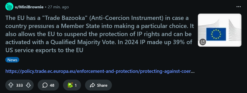 what the fuck? Cant believe i woke up to trump putting tariffs on euro nations for Greenland. I remember hpw people keep saying how trump would eventually forget greenland or how he wants to buy it cause its big. Theyre fucked now lmao.