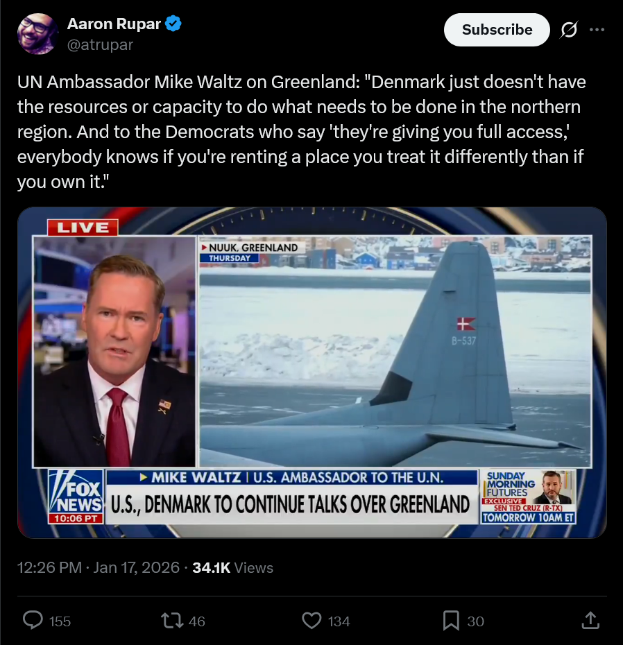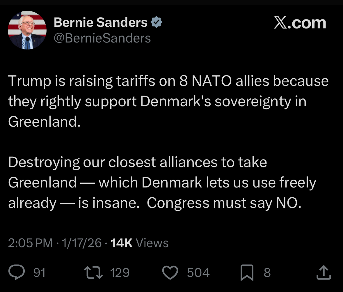 >Swedish Prime Minister Ulf Kristersson’s response to today’s threats of tariffs by President Donald J. Trump over Greenland:>“We will not let ourselves be blackmailed. Only Denmark and Greenland decide on issues concerning Denmark and Greenland. I will always stand up for my country, and for our allied neighbors. This is an EU issue that affects many more countries than those now being singled out. Sweden is now having intensive discussions with other EU countries, Norway, and the United Kingdom for a coordinated response.”