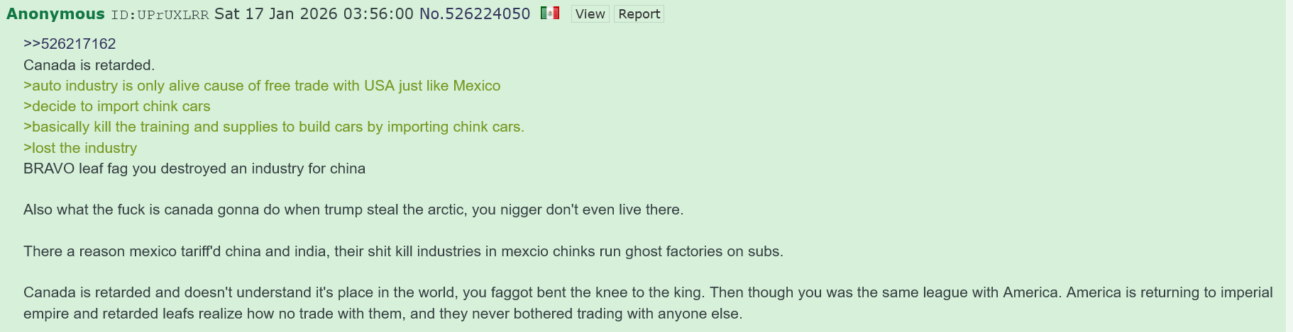 >>526259353nah you just gave your whole auto industry to mexico. this spic said it best in another thread. kinda funny that a random brown spic is smarter about geopolitics than so-called "White" canadian