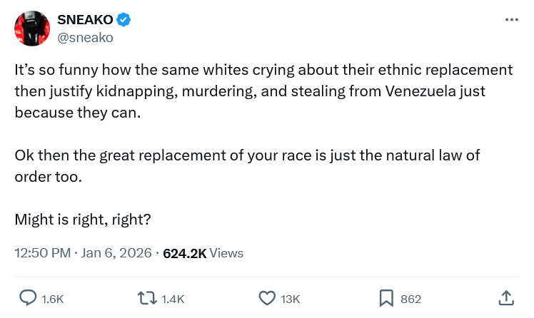 >>526275287>Still funny that this ragtag group of people are the most public defenders of the white race>sneakohow is it that you retards are STILL falling for the grift? :/https://x.com/sneako/status/2008642299316634073