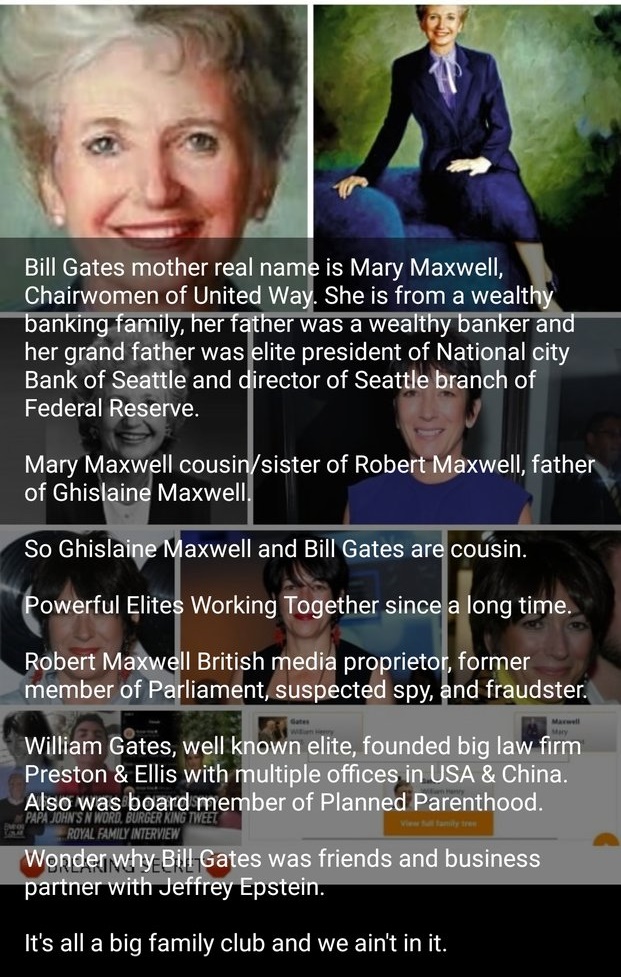 Bill Gates mom is cousins with Ghislane's dad, Both Maxwell>>526279102shhh the modernist goy don't know this!