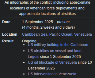 >>526284198>>Obama's 8 month war>>zero casualties XDHow is it a war? And yes, there were zero casualties. >>Trump's 2 week special operationTrump has had a military blockade against Venezuela (an act of war) for much longer than two weeks.