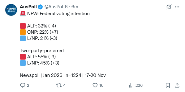 Big boy poll came out, One Nation has surpassed Liberals on primary votes. Labor are crashing in every poll