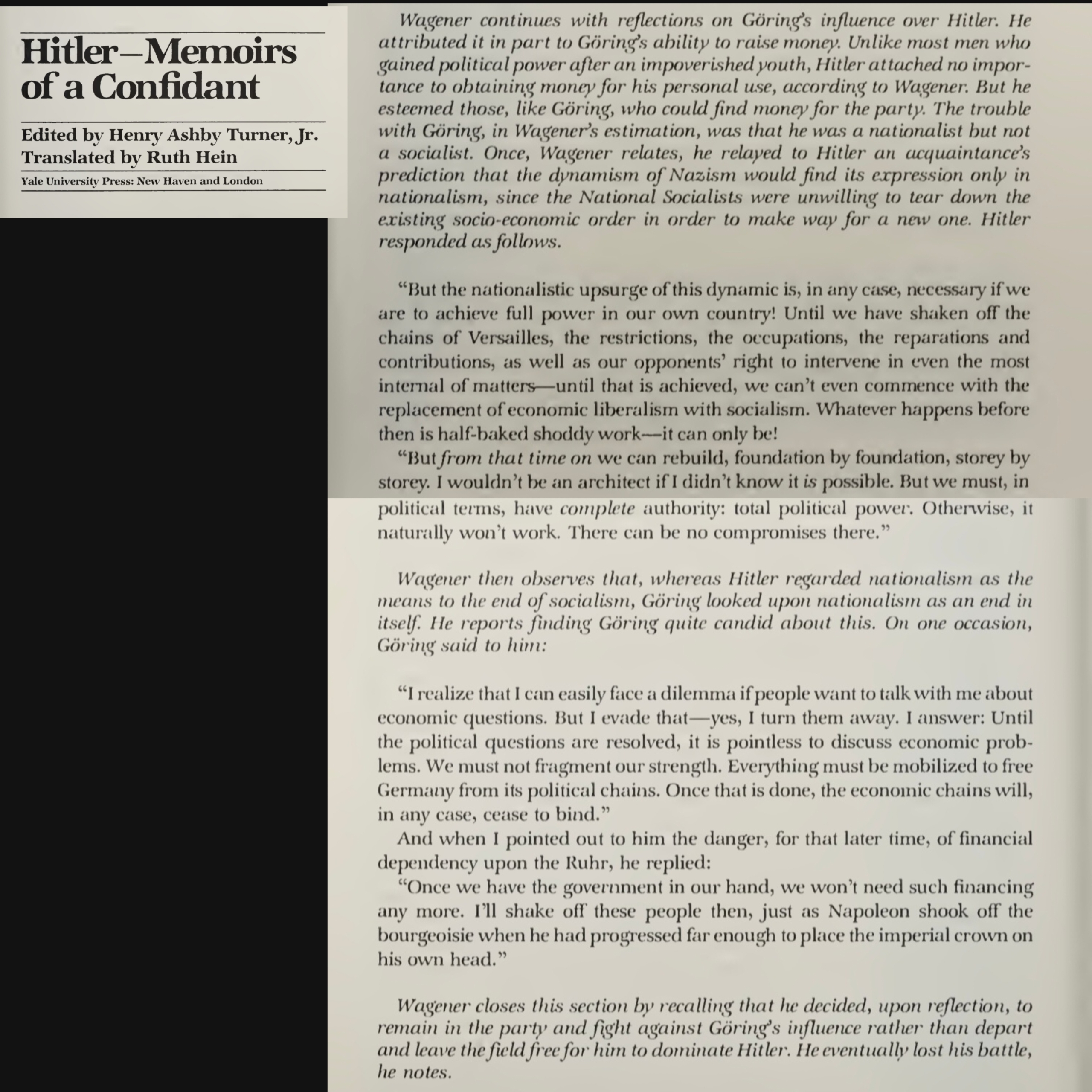 >>526294506Hitler's economy was a mixed model but it went further than Mussolini's or even FDRs model of it.What all these 3 had in common was that the authority of the owner, whether in form or shareholders or singular man was circumvented in one way or another, in Hitler's case it was done by appointing party officials on every management ladder that could override the decisions of the actual management, which is similar to how modern day China implements state control over their corporations. Their monetary policy was basically insane(Schacht quit because of it) and I don't think it can be deducted what was their exact model because it was obviously rearm now think about financial fluidity later - by mid 1939 mepo bills were seen as toilet paper by contractors, who were forced to keep accepting contracts by the party moles regardless.This doesn't fit the definition marxists have of neither socialism or capitalism. The ownership of means or production is still in capitalist hands but the factual control over them is in hands of the state(so what is the formal ownership worth?) that among other things acts as an arbiter between labour and the business interests. This entire topic is retarded because it's not really about what the nazis were or weren't, but rather as an attempt to morally shame the other sides. Ooooooh oooooh communists literally nazeeeeeeez, nooooooooooo capitalists are real nazeeeez, no-o you, gagaga gugugu. Intellectual kindergarten.