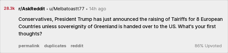 https://www.reddit.com/r/AskReddit/comments/1qfiit5/conservatives_president_trump_has_just_announced/-400,000, downvotes[message deleted by moderator][you have been banned from r/askreddit] +60k, upvotesnot a conservative, but conservatives are evil and dumb! and they are nazi!