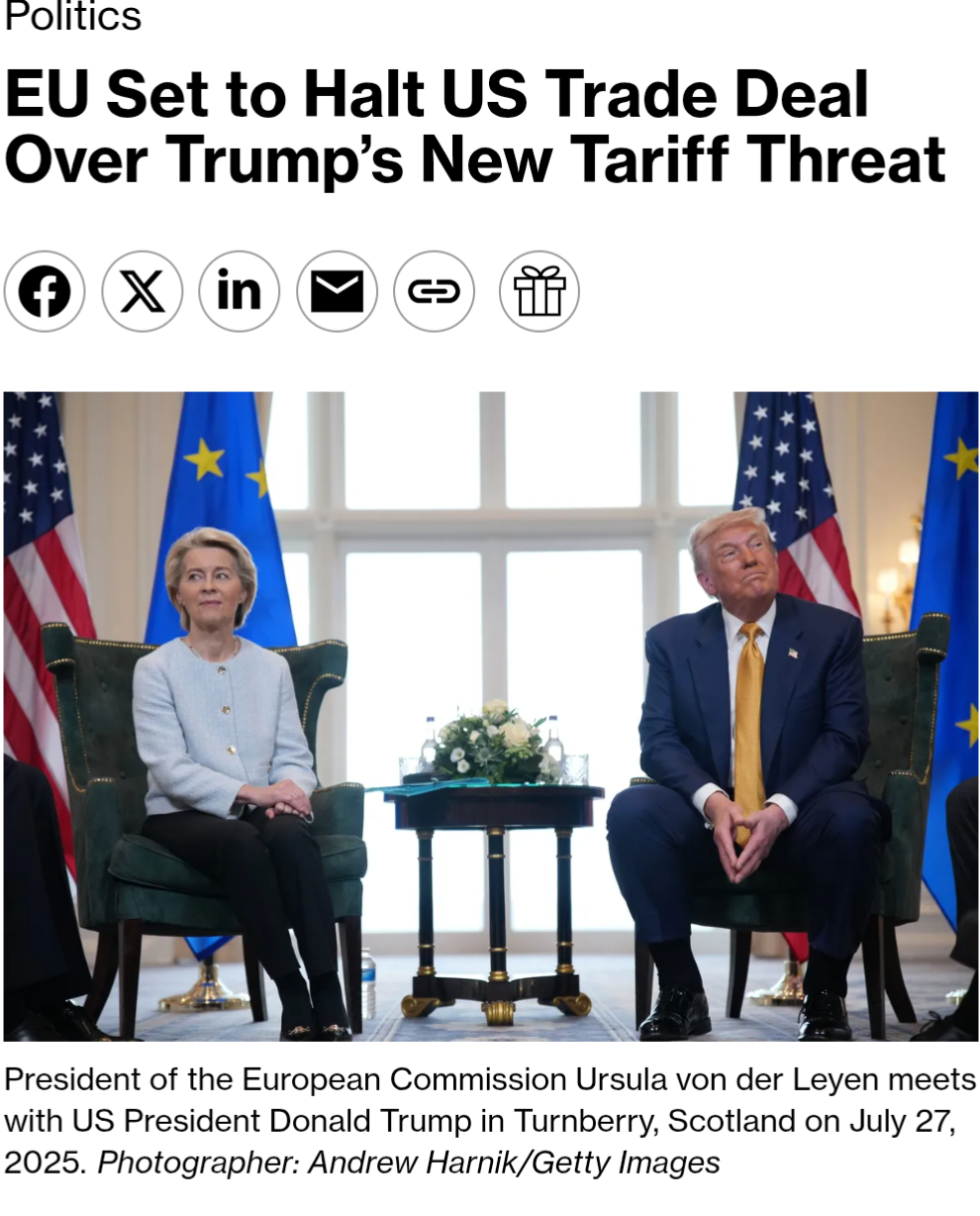 European Union lawmakers are poised to halt approval of the EU's trade deal with the US over President Donald Trump's vow to impose tariffs on countries that supported Greenland.Manfred Weber, president of the European People's Party, said agreement with the US is no longer possible due to Trump's threats regarding Greenland, and that the EU agreement to lower tariffs on US products must be put on hold.The trade agreement's passage has become more complicated, with some EU lawmakers calling for work on implementing the trade accord with the US to be suspended until Trump's threats cease, and for the EU to use its anti-coercion instrument in response.https://www.bloomberg.com/news/articles/2026-01-17/eu-set-to-halt-us-trade-deal-over-trump-s-latest-tariff-threat