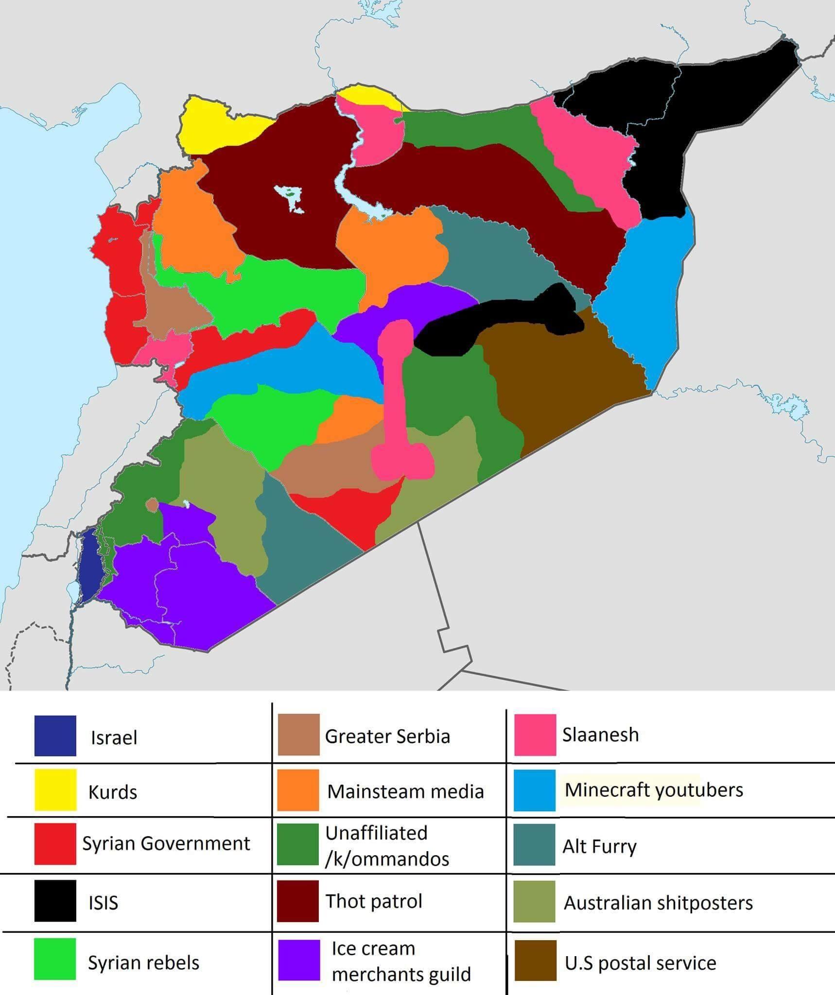 >>526305443ISIS got whacked, now they're a bunch of goatfuckers hiding out in the middle of the Syrian deserts. who randomly come out of the wastelands to blow up random peopleAssad's currently hiding out in Russia playing Xbox live with the money he lootedThe Blue in the bottom of the Map is Israel just walking in and taking the land because Syria can't do shit to them without getting bombed.