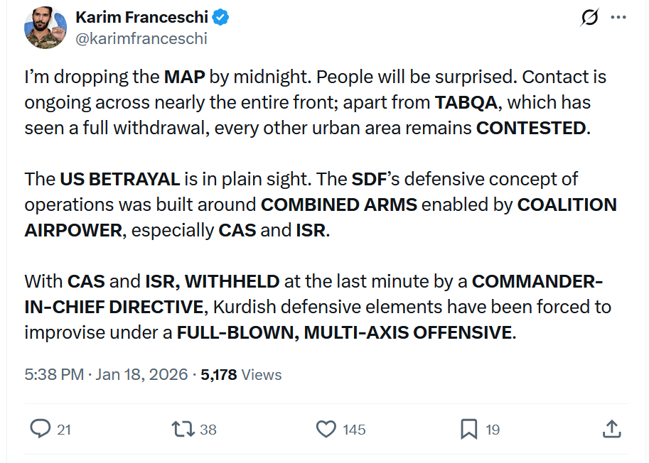 >>526303224Amazing speed, tribal and other local uprisings everywhere even inside Raqqa city now. As I understand it technically the Syrian army is supposed to not cross the river even if they already did it in places but SDF is on the run and Abdi is in Damascus to negotiate i.e. be offered a way worse deal than the initial one. PKK leaders starting to flee the country to Iraq.