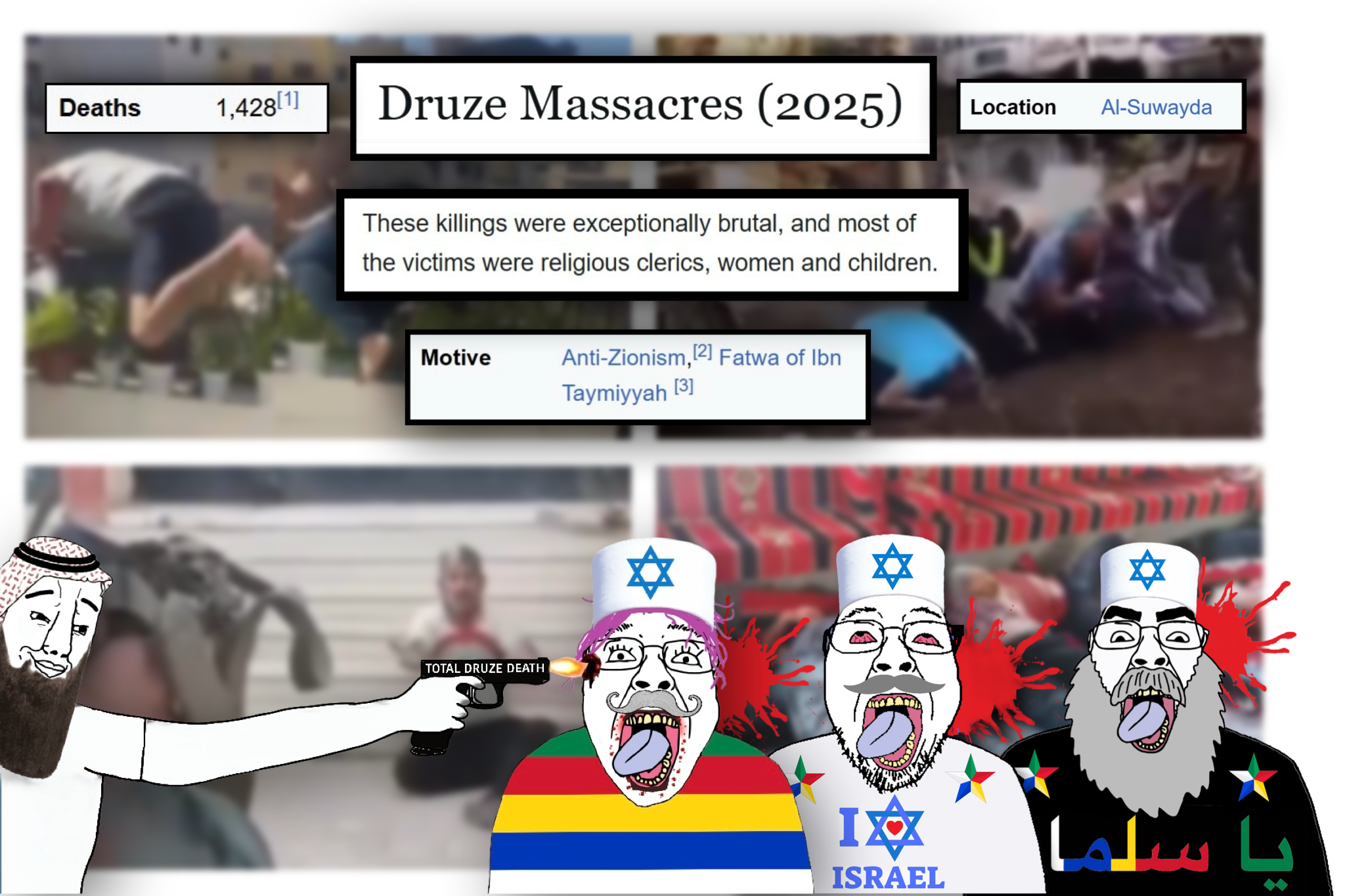 >>526347596>Al-Bakarathose are the exact ones that btfo druze after being massacred , what retards>>526347853this time it was atheist satan worshipper yazidis and alevis killing sunnis>>526347939alawite subhumans were calling for israel too