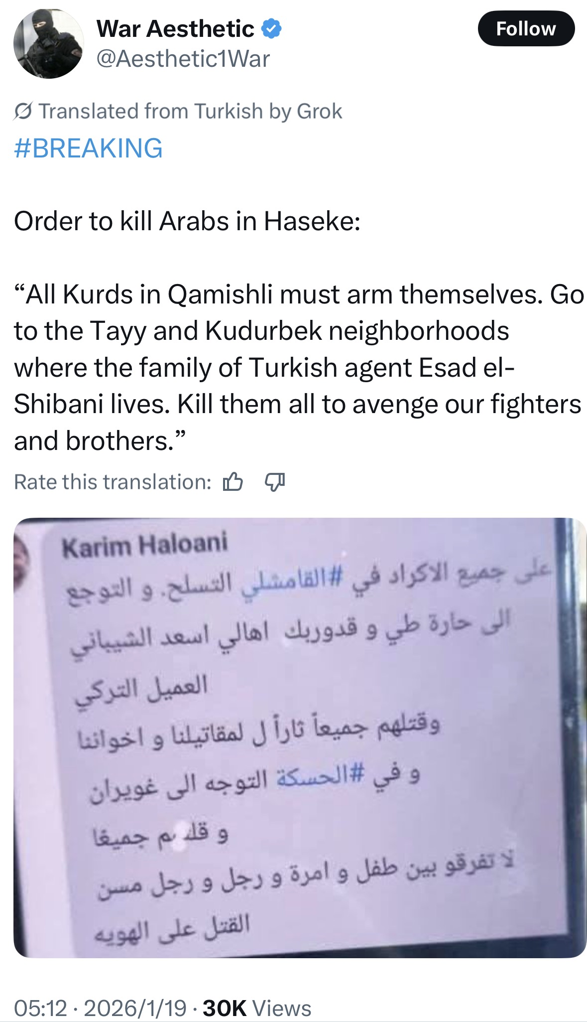 >>526347596As far as it can be confirmed, the SDF retaliated against the arab tribes, and now the arab tribes are denouncing genocide.In any case no faction can be trusted right now as disinformation will be rampant.