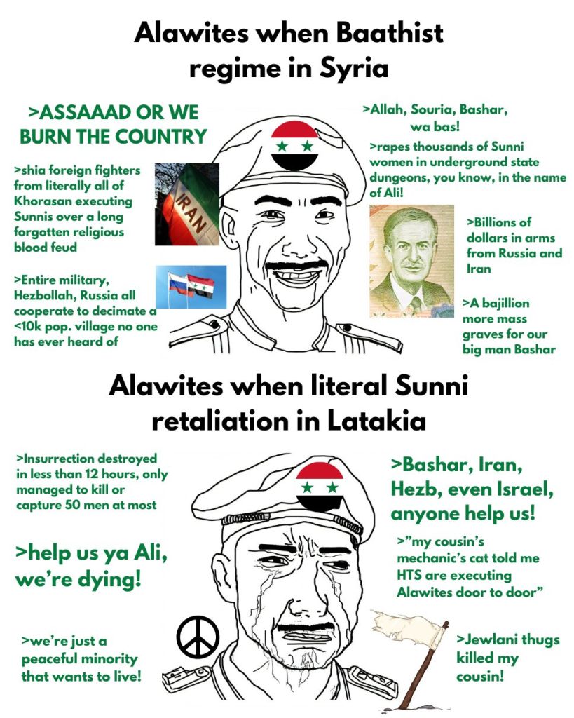 >>526347939>>526348861Yet Bashar was not busy killing people until the civil war. And while incompetent, he had nothing to gain from the civil war, only lose. And his wife is Sunni Arab. And Alawites experienced massacres near start of the civil war, 2012: https://en.wikipedia.org/wiki/Aqrab_massacre . And very many Alawite men died during the civil war. And many Sunni Arabs served in the military. And if Hafez was against Sunni Arabs, why would he have made the Arab belt? https://en.wikipedia.org/wiki/Arab_Belt_project Why would he have tried to transfer power to his Sunni Arab government officials at some point in the 1980s? He did get triggered after the assassination attempt against him, but leaders usually get triggered by assassination attempts. I can better see the argument with Bashir, with inviting various militias into Syria, but that seems less driven by ethnic hatred and more Bashar's general weakness and incompetence. And Iran shooting itself in the foot.And now you have Russia working together with the Syrian government, all while Israel and its golems the USA and most of Europe are waiting to backstab their puppet al-Sharaa once it is opportune. They have plenty of casus belli for it, after all, al-Sharaa had a $10 million bounty on himself once.