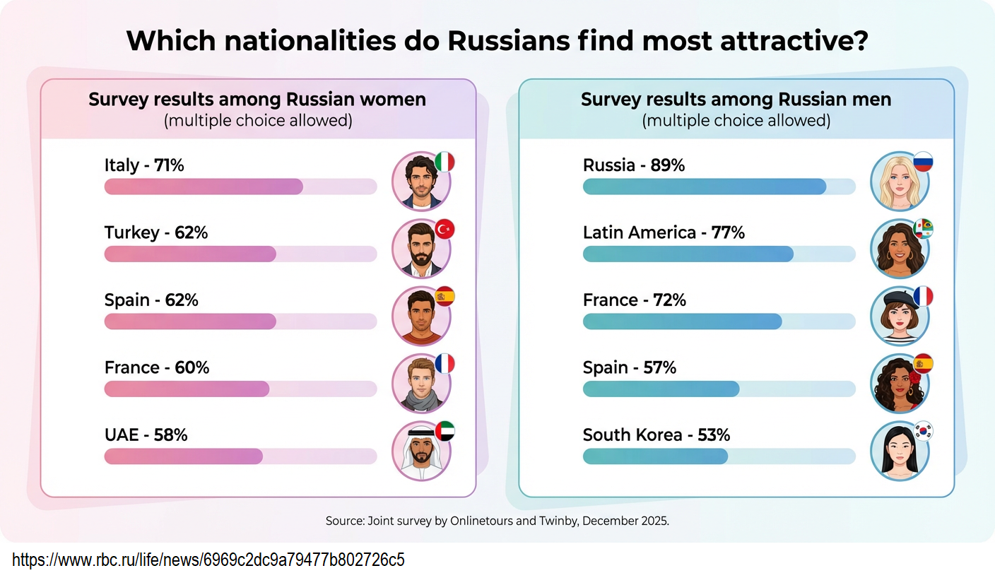 Survey says Russian women prefer Italian and Turkish chads. Dreadful results for Russian men.Here are Russian sources for those who doubt OP's credibility https://www.rbc.ru/life/news/6969c2dc9a79477b802726c5https://lenta.ru/news/2026/01/16/rossiyanki-nazvali-strany-s-samymi-krasivymi-muzhchinami/
