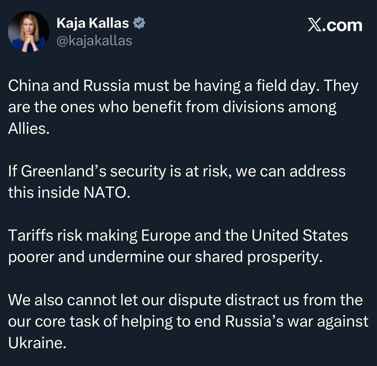 >>526308086>same alarmist muh china muh russia as always from the resident eutard>if greenland can be addressed via nato, then why does it matter if its american instead>how can mutual tariffs make both sides poorer? isnt the money just remaining? >how are you helping to end the war if your not negotiating, or rather youre going against us proposals for no apparent benefit to anyoneeasiest job in the world to write this sub80 slop, kaja is a genius, europeons must be ecstatic to vote for her again