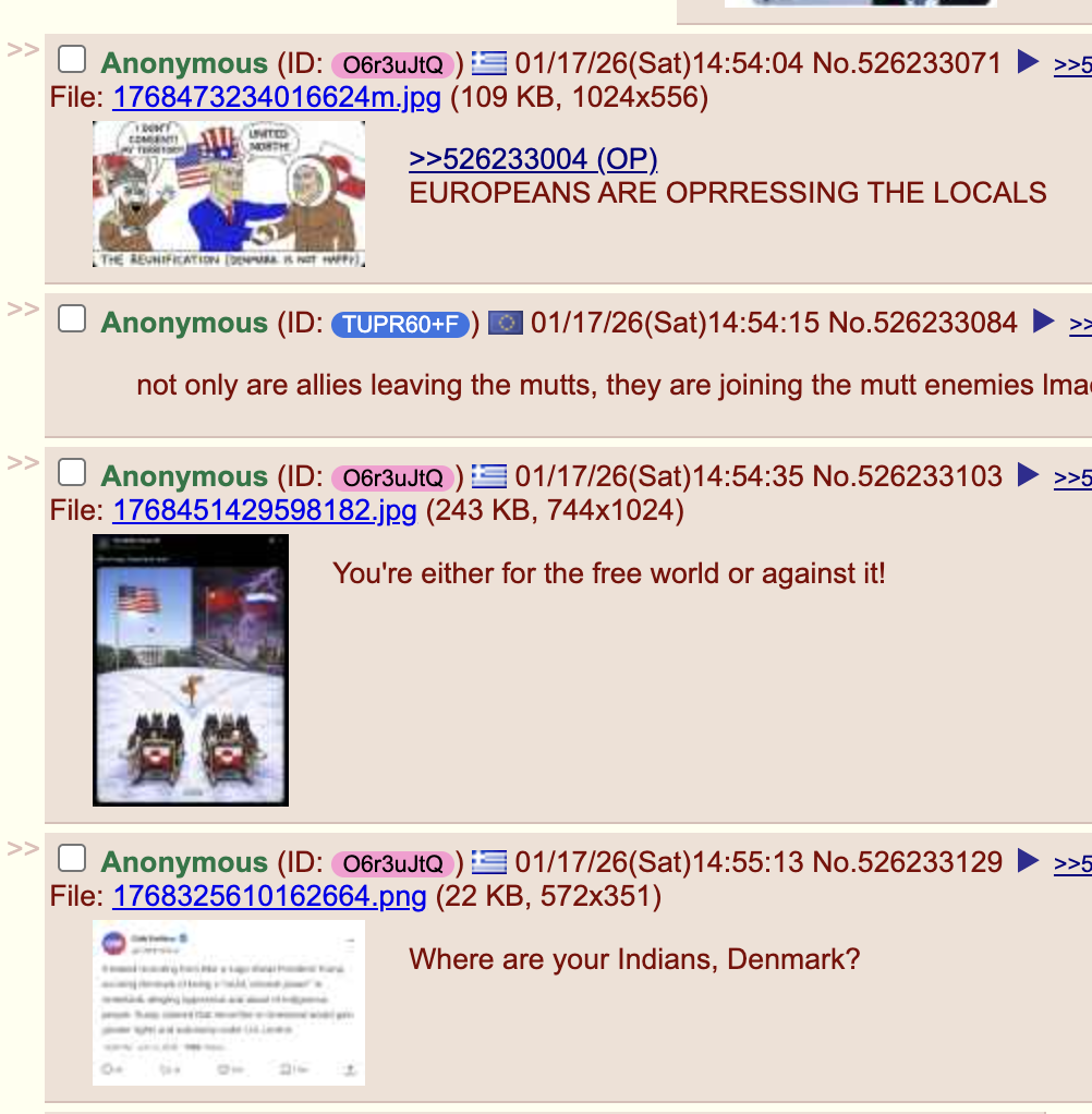 >>526310567>Trump and his schizophrenic oligarchs are openly threatening annexation of your territory>"b-but this will distract from our real enemy of RUSSIA and CHINA"golem vassalage