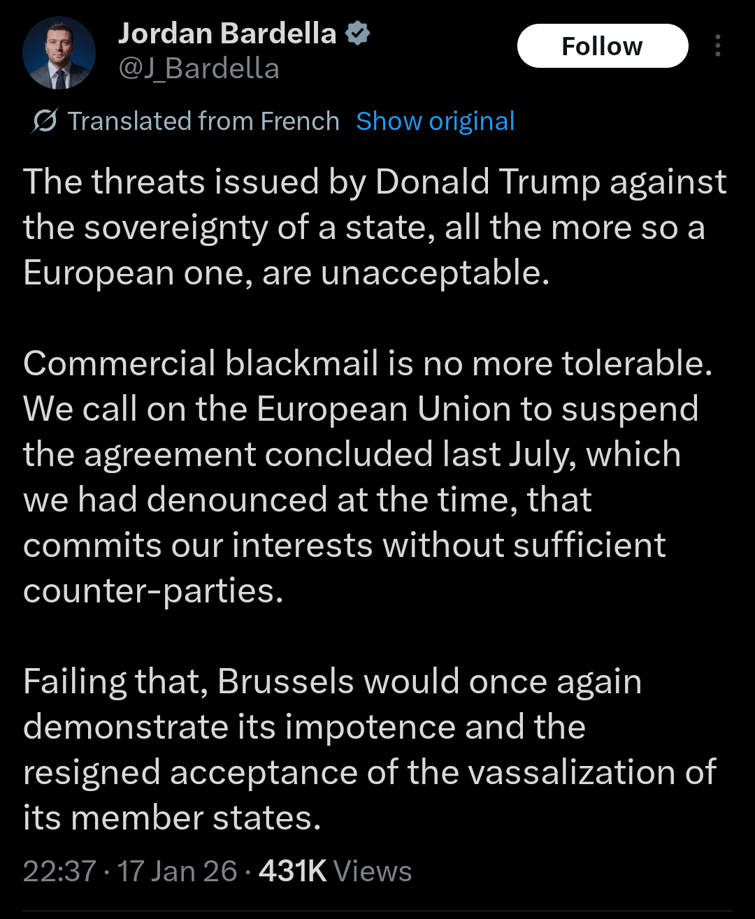 Leader of France's Far Right calls to suspend EU-US trade agreement in response to Trump's threats