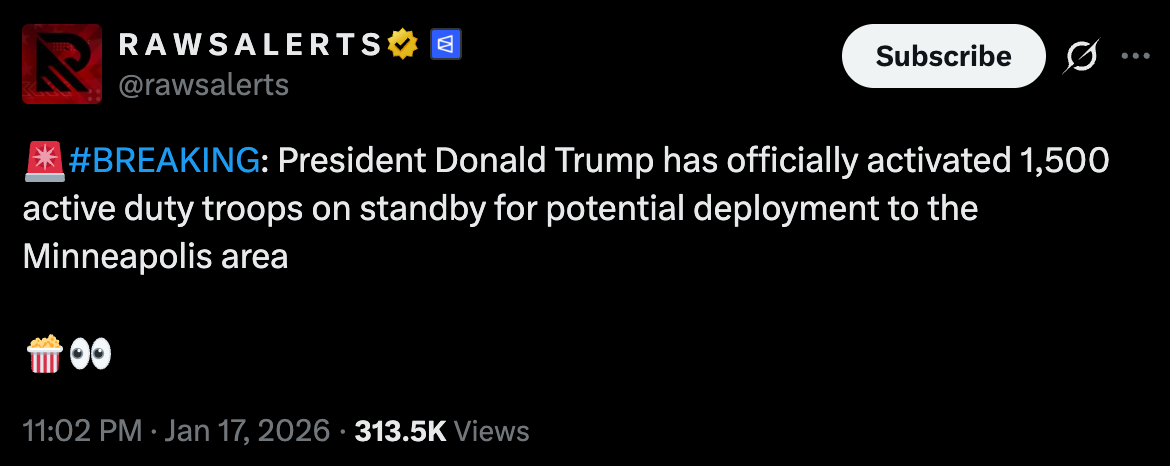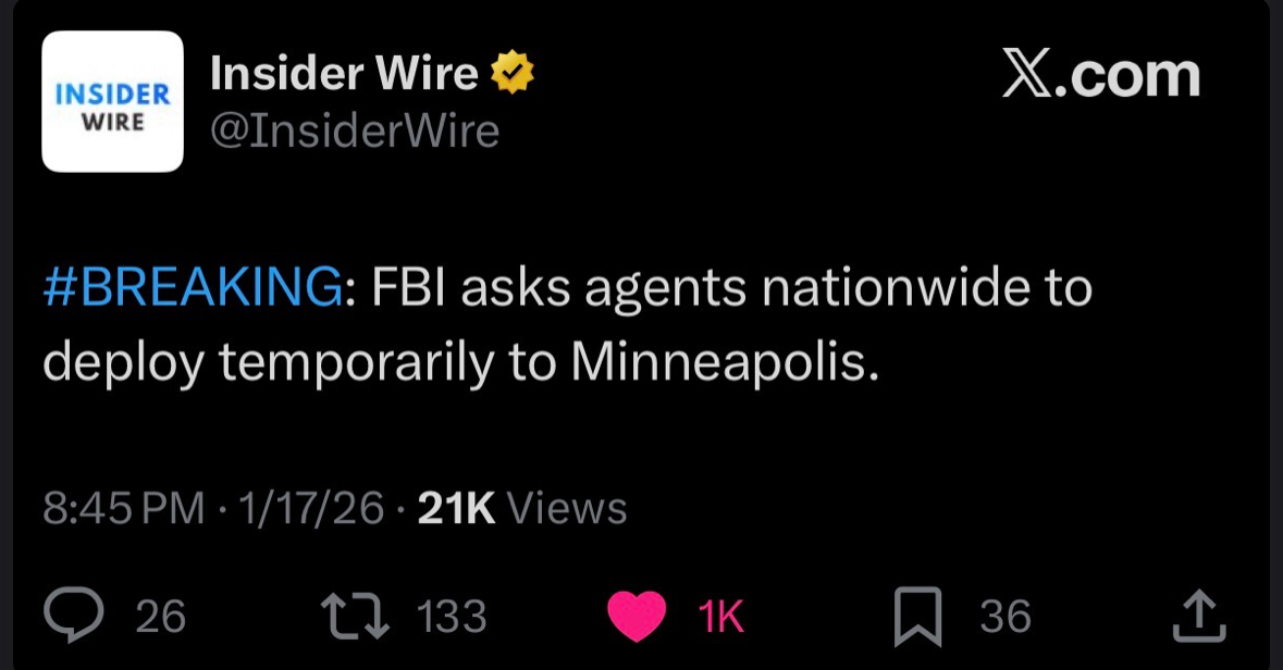 Between the military lawyers, Feds, national guard, ICE, and 2 battalions on standby we may actually see something pop off today. https://x.com/insiderwire/status/2012733010030784854?s=46