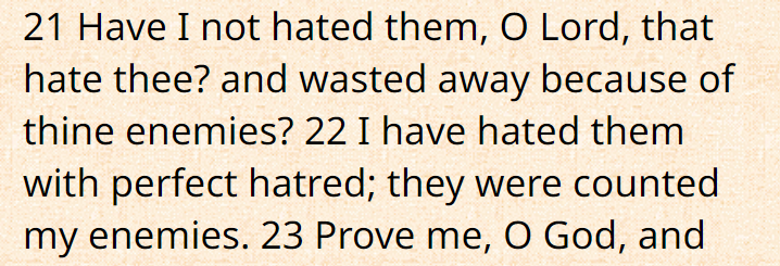 >>526317844Do not I hate them, O Lord, that hate thee? And am not I grieved with those that rise up against thee?Psalm 139:21 KJVAAEhttps://bible.com/bible/546/psa.139.21.KJVAAE