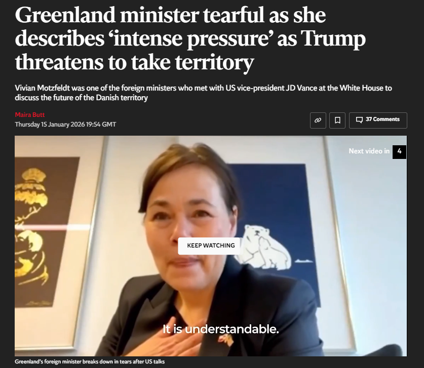 yikes...https://www.dw.com/de/news-kompakt-bundeswehr-schickt-soldaten-nach-gr%C3%B6nland/a-75511813>16.01.2026>In the conflict with the US over Greenland, the German armed forces are sending soldiers to the Arctic island. Thirteen German soldiers are scheduled to arrive in the capital, Nuuk, this Thursday as part of a European reconnaissance team. This was announced by the German Ministry of Defense on Wednesday.>According to Berlin, the German soldiers are to remain in Greenland until at least Saturday. Their task is to explore the "framework conditions for possible military contributions to support Denmark in ensuring security in the region."It was planned from the entire start that they stay till Saturday and then leave. They figured out we have no military and then leave.