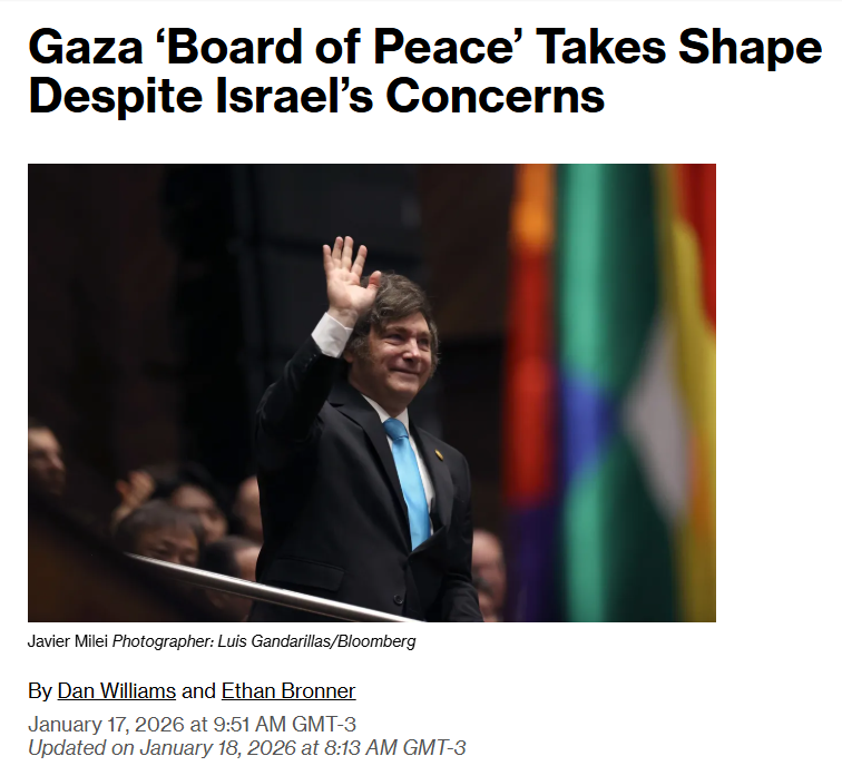 Israel is "baffled" as Trump invites Lula and Milei to decide the peace of Gaza.https://www.bloomberg.com/news/articles/2026-01-17/milei-erdogan-invited-to-join-trump-s-gaza-board-of-peacePresident Lula is considered a persona non-grata in Israel, his entrance in Israel is forbidden, he has never "kissed the wall", and was expelled with brazilians from Israel after he mocked 'Israel for fighting a valiant war against poor women and children' in Gaza. President Lula became of one of Trump's personal friends after they met in Mar-a-lago to resolve the tariff war between both countries, where they quickly resolved the pointless trade war and started bonding over the time they spent in jail.Javier Milei is Trump's protegeé and a relatively young president. Among his feats so far, he has disappeared with all the gold of his country, sold out his land to israelites (who proceeded to set it on fire), sold his rare earth reserves to Elon Musk, used the Mercosur deal to defend the USA boarding venezuelan ships while everyone was concerned about the EU accepting a trade deal.Why is Trump inviting Brazil and Argentina to decide the fate of Gaza?