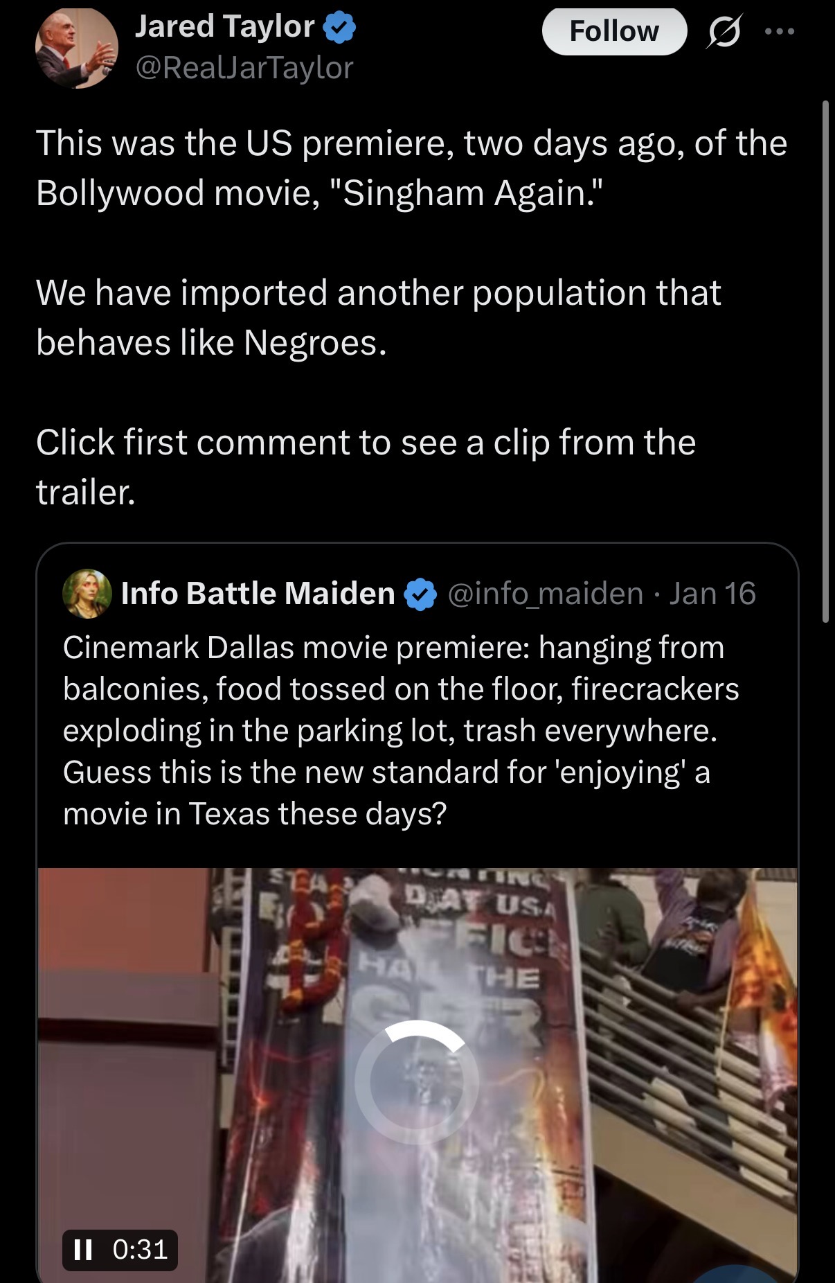>>526324011>https://x.com/RealJarTaylor/status/2012920973742248050This throwing milk on the large tall posters and large tall cutouts/statues of politicians and filmstars is an exclusively south indian/dravidian nigger thing. These people are not indian, they are sri lankan. The kikes got them here from ethiopia 3000 years ago and have been collaborating ever since to loot india. They do these deliberate obscene things to defame india, clearly!