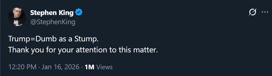 The King has spoken, drumb BTFO foreverhttps://x.com/StephenKing/status/2012213455520981101