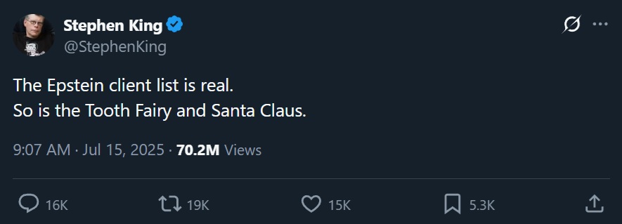 If Stephen King hates Trump so much, why not implicate his actions on the Epstein island? Stephen King definitely spent more than his fair share of time there. He must have crossed paths with Trump at some point.