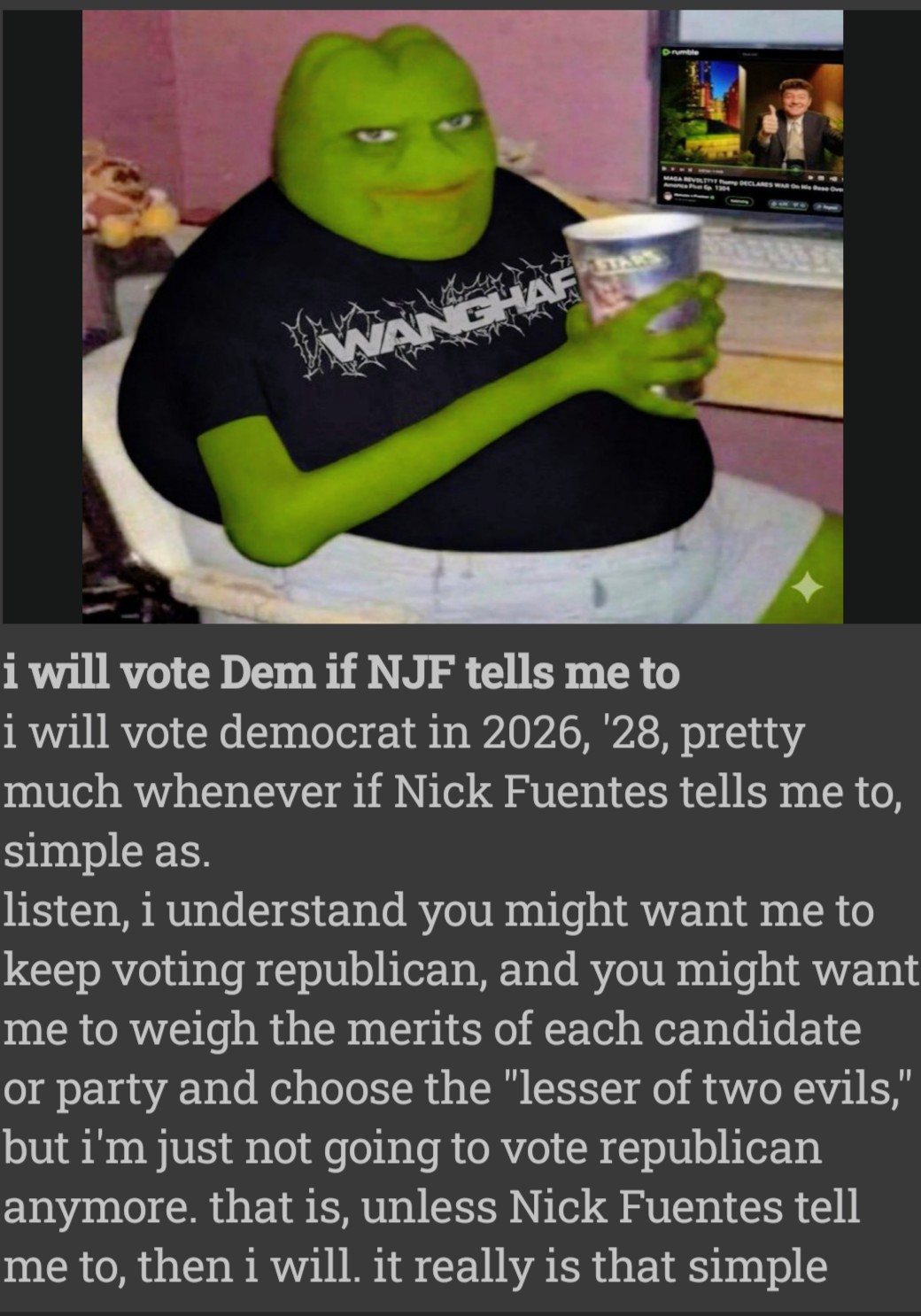 >>526329404>Do they really think they’re edgy with this? Not a single one of them is white, they would have all ended up in the oven during WW2.i will vote democrat in 2026, '28, pretty much whenever if Nick Fuentes tells me to, simple as. listen, i understand you might want me to keep voting republican, and you might want me to weigh the merits of each candidate or party and choose the "lesser of two evils," but i'm just not going to vote republican anymore. that is, unless Nick Fuentes tell me to, then i will. it really is that simple