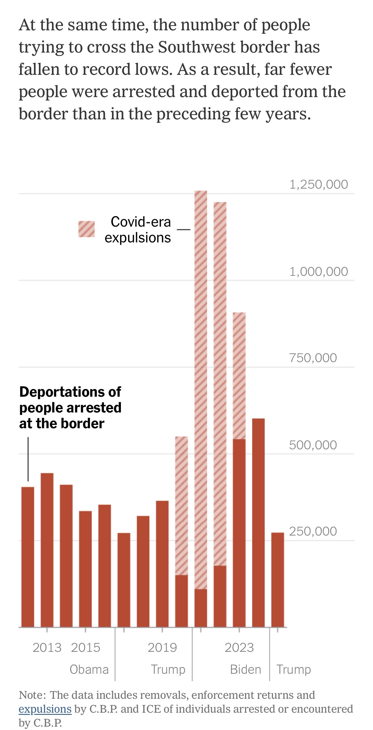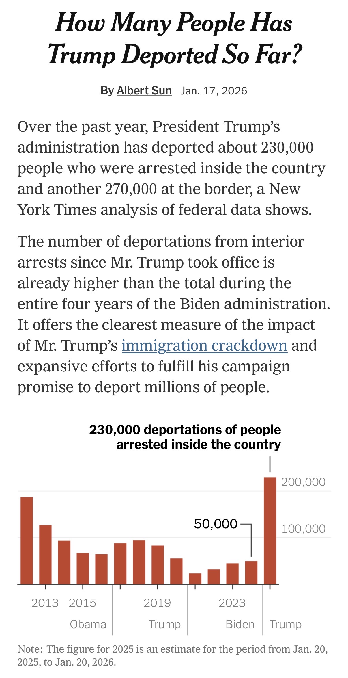> Over the past year, President Trump’s administration has deported about 230,000 people who were arrested inside the country and another 270,000 at the border, a New York Times analysis of federal data shows> the number of people trying to cross the Southwest border has fallen to record lows. As a result, far fewer people were arrested and deported from the border than in the preceding few years> Another roughly 40,000 people returned to their countries after signing up to “self-deport” and receive a stipend through a novel program and app provided by the administration.> That brings the total number of deportations since Mr. Trump took office to 540,000 — fewer than in the last two years of the Biden administration, when border crossings were at record highs. There were 590,000 total deportations in 2023 and 650,000 in 2024.