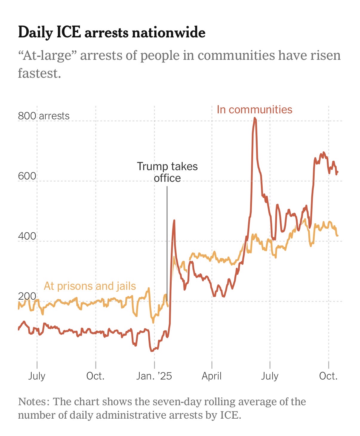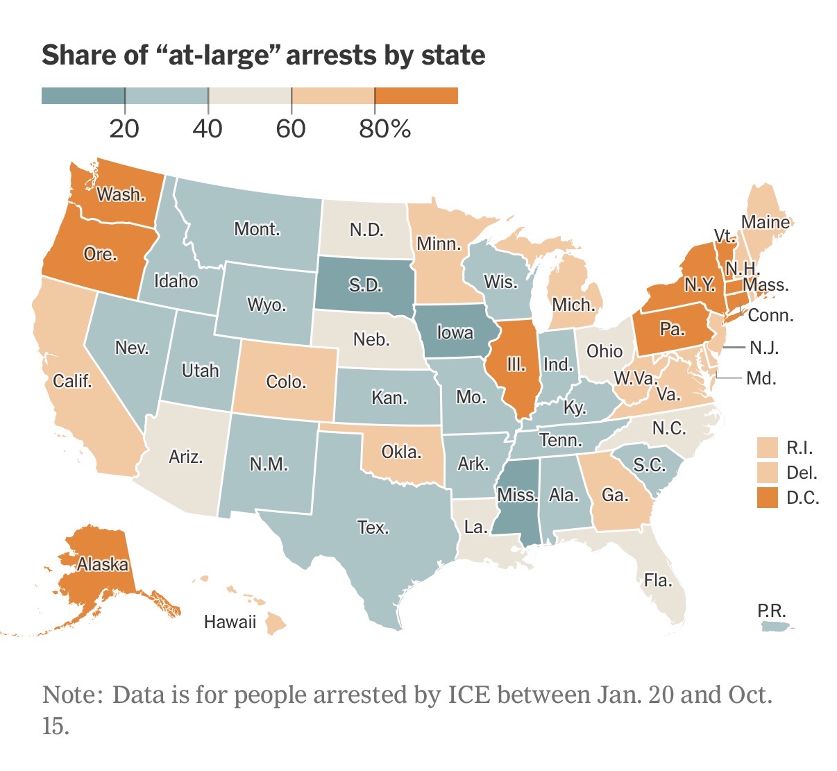 > Arrests at jails and prisons went up over the past year, but the increase was far exceeded by the growth in what ICE calls “at-large” arrests, the apprehensions of immigrants on the streets, in courthouses, and at homes and businesses. These quadrupled to about 150,000 and made up a majority of immigration arrests in 32 states and Washington, D.C.>They were most common in states like California, Illinois and New York, where local governments have passed laws blocking local jails and prisons from transferring people to ICE custody.
