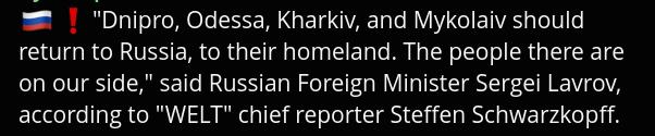 HAPPENING!>HAPPENING!HAPPENING!>HAPPENING!HAPPENING!>"Dnipro, Odessa, Kharkiv, and Mykolaiv should return to Russia, to their homeland. The people there are on our side," said Russian Foreign Minister Sergei Lavrov, according to "WELT" chief reporter Steffen Schwarzkopff.