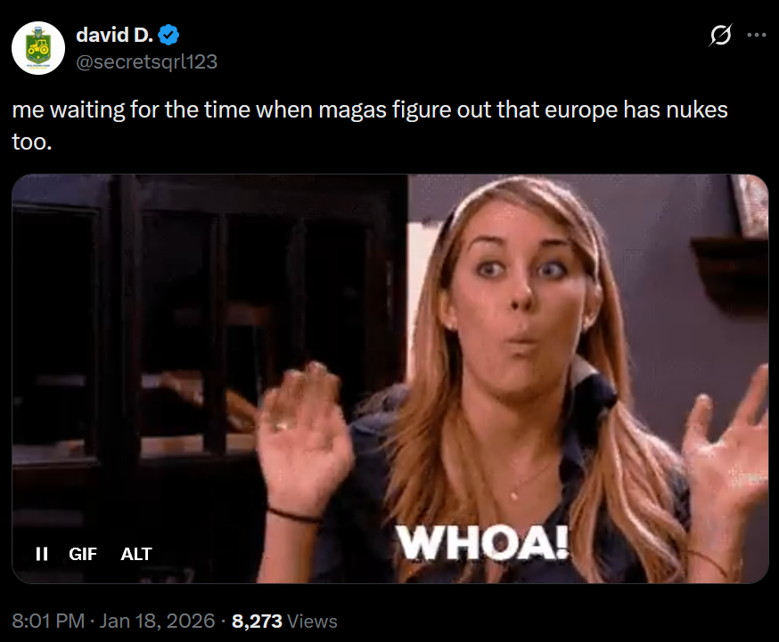 >"Russian missiles headed to the USA would fly over Greenland, that’s why it’s important.">ok stupid...>1 we already have a early warning station there..>2 most russian nukes are now in subs, they will NOT fly over greenland>3 most of our early warning is satellite based>4 the early warning DEW system was removed years ago for NOT being effective in that role >5 of the 17 basses we had 16 are now shut down, and the DOD has stated that NO NEW troops or basses will be added if we get greenland>so keep thinking that..LOLOL