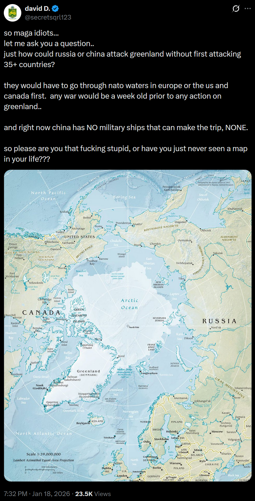 >so maga idiots...>let me ask you a question..>just how could russia or china attack greenland without first attacking 35+ countries?>they would have to go through nato waters in europe or the us and canada first. any war would be a week old prior to any action on greenland..>and right now china has NO military ships that can make the trip, NONE. >so please are you that fucking stupid, or have you just never seen a map in your life???