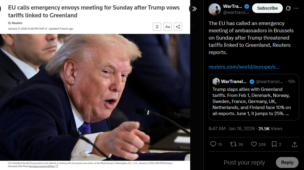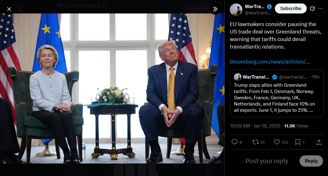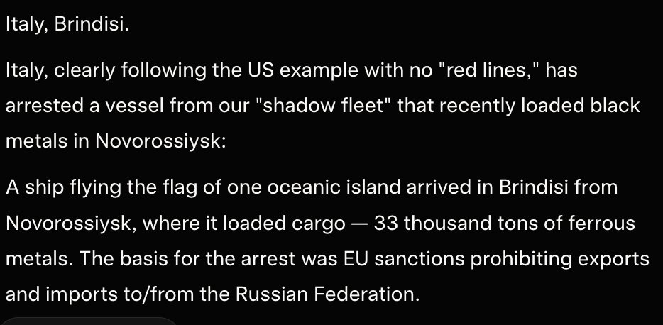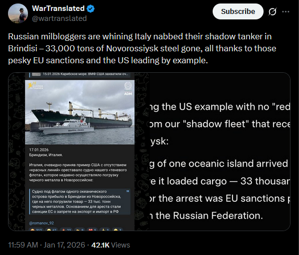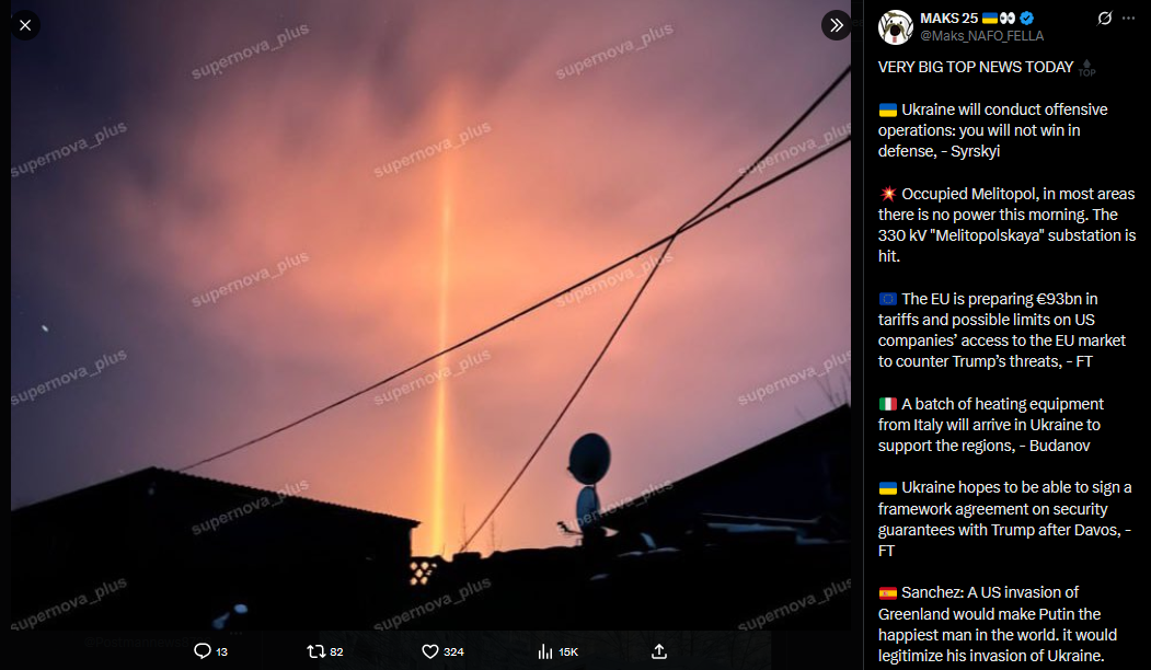 https://x.com/Maks_NAFO_FELLA/status/2012987806524551610?s=20VERY BIG TOP NEWS TODAY Ukraine will conduct offensive operations: you will not win in defense, - Syrskyi Occupied Melitopol, in most areas there is no power this morning. The 330 kV "Melitopolskaya" substation is hit. The EU is preparing €93bn in tariffs and possible limits on US companies’ access to the EU market to counter Trump’s threats, - FT A batch of heating equipment from Italy will arrive in Ukraine to support the regions, - Budanov Ukraine hopes to be able to sign a framework agreement on security guarantees with Trump after Davos, - FT Sanchez: A US invasion of Greenland would make Putin the happiest man in the world. it would legitimize his invasion of Ukraine. Europe may expel US military bases from its territory if the US annexes Greenland, - The Economist. Poland announced a fundraiser for generators for Kyiv — the initial amount was raised in a matter of hours, so the collection was continued. "NATO has prepared a plan for a complete blockade of the Kaliningrad region," stated former Lithuanian Deputy Foreign Minister. ATESH agent successfully carried out sabotage in Bryansk region, disabling the electrical substation's equipment. Nuns from Belarus suspected of espionage in Sweden, – The Telegraph A Russian shadow fleet vessel has been arrested in Italy. Lithuania will make a decision on additional energy assistance to Ukraine in the coming days, — Shmyhal EU calls emergency meeting of ambassadors over Trump's tariff war over Greenland, - Reuters>part 1