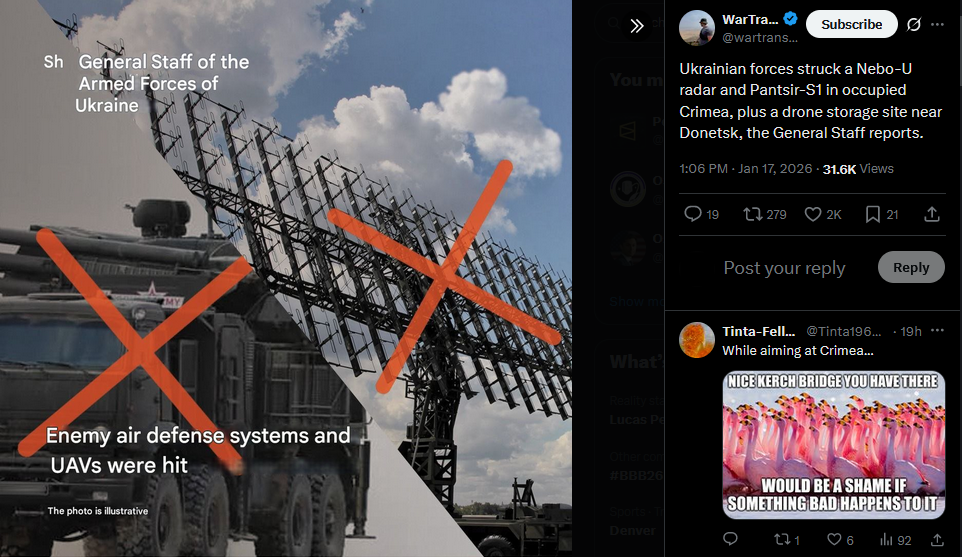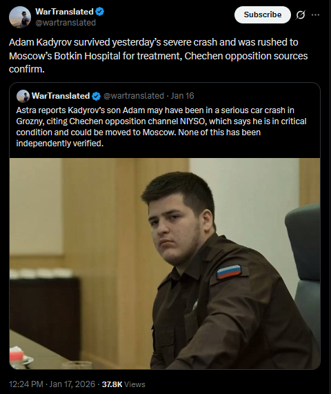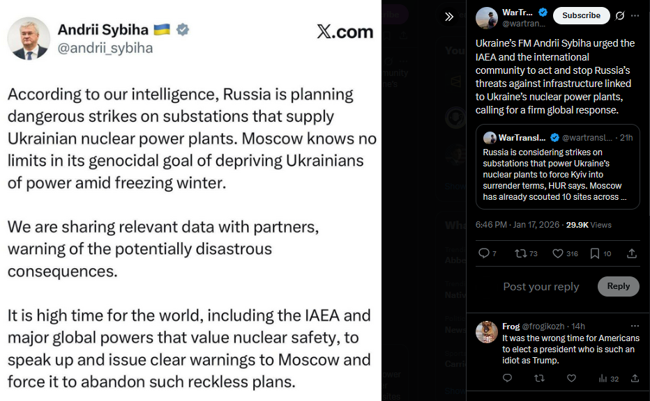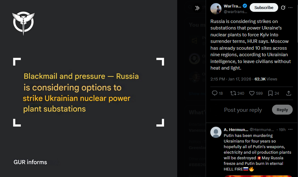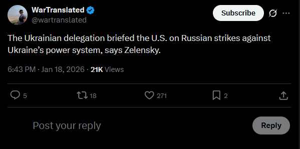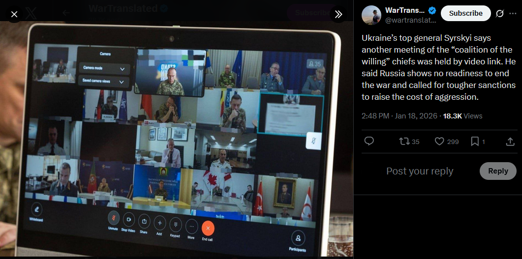 Ukraine’s top general Syrskyi says another meeting of the “coalition of the willing” chiefs was held by video link. He said Russia shows no readiness to end the war and called for tougher sanctions to raise the cost of aggression.https://x.com/wartranslated/status/2012899821183434931?s=20>8h