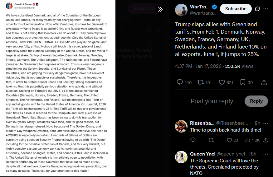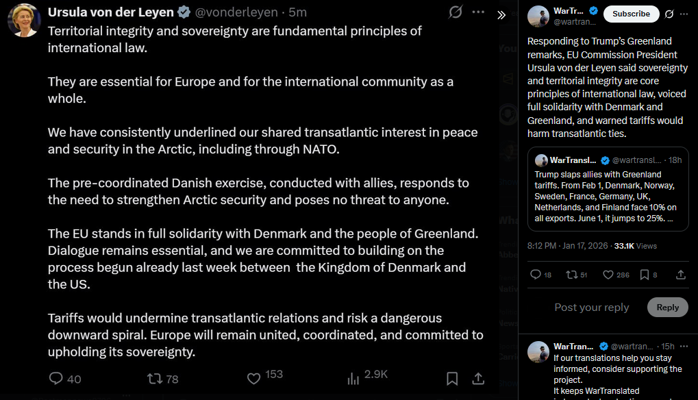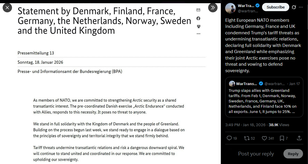 >>526350606Eight European NATO members including Germany, France and UK condemned Trump's tariff threats as undermining transatlantic relations, declaring full solidarity with Denmark and Greenland while emphasizing their joint Arctic exercises pose no threat and vowing to defend sovereignty.https://x.com/wartranslated/status/2012915255236509875?s=20>7h