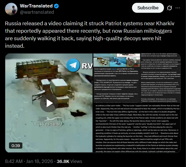 Belgorod’s governor claims local businesses have supposedly bought laser air defense against drones, apparently as a last-ditch effort to shield factories from constant UAV strikes.https://x.com/wartranslated/status/2012968444287729816?s=20https://files.catbox.moe/o1sonc.mp4