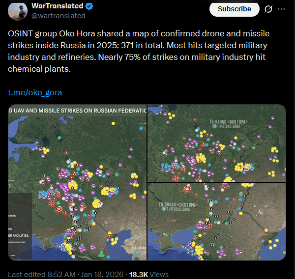 Previous: >>526321885Day 1,425 – Daily assessment: understandingwar.org/analysis/russia-ukraine/#research▶Latest>Bilhorod governor says local businesses bought laser air defense systems as a last resort to shield factories from constant Ukrainian strikes>Syrskyi confirms Ukraine has plans for offensive operations in 2026>Melitopol substation struck, most of occupied Zaporizhzhia without power>Italy seizes russian tanker with 33k tons of steel>Grozny is on lockdown because Kadyrov's son Adam got into a car crash>China halts all electricity imports from russia>russia losing 25,000 troops monthly - Mark Rutte>Reuters reports that the US may attack Iran within the next 24 hours.>Emergency situation will be declared in energy and power sector - Zelenskyy>At least 20% of russia's shadow tanker fleet has been stopped - Zelenskyy>Zelenskyy says Ukraine is finalizing a historic security deal with the US>UK to develop new deep-strike ballistic missiles for Ukraine>Norway announced a new aid package for Ukraine worth $400 million>The number 1418 is now banned and considered extremist>Moldova and Ukraine have jointly imposed a full blockade on trannystria>The 3 day SMO has now lasted longer than the entire soviet-German war>Ukrainian forces struck an oil depot in russia’s Volgograd region and hit multiple russian military targets in occupied Ukrainian territories, the General Staff said.▶Telegramrentry.org/telosint2023t.me/ukr_pics▶Intelt.me/DeepStateENodin.tradoc.army.mil/WEG (equipment explorer)ukr.warspotting.net (visually confirmed losses)▶Mapsdeepstatemap.live/enliveuamap.com/en▶DISPOSABLE SOLDIER (diary of a RU mobik)TOURS 1-4: files.catbox.moe/mpcw7p.zip▶12 min of TZD in one ditch (Pokrovsk area) - 28 killedfiles.catbox.moe/sxbxfb.mp4 (embed)