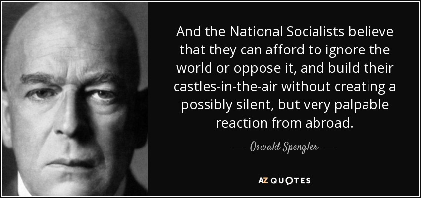 >>526351026This is why Spengler>all other writers of that time, he literally told nazis to fuck off and stated Hitler had no fucking idea what they were doing, imagine having the balls to tell this.Personally I think Spengler will become more and more important to german and european identity, as the last and greatest prose composer and history and political philosopher Germany produced before entering fully civilization winter phase. His posture is interesting, mostly in how defines a race more as a world feeling than something biological, hence even thirdies can side with western (faustian) civilization and defend it while there is plenty of "white" people who want to see it torn apart.Him defining western culture as a psychological search for infinite breaks away with the political spectrum, it goes beyond liberalism, capitalism, socialism even religion. It perfectly explains how german scientists under the Soviet Union managed a space program, nuclear weapons and industrialization but then it all collapsed once they passed away.