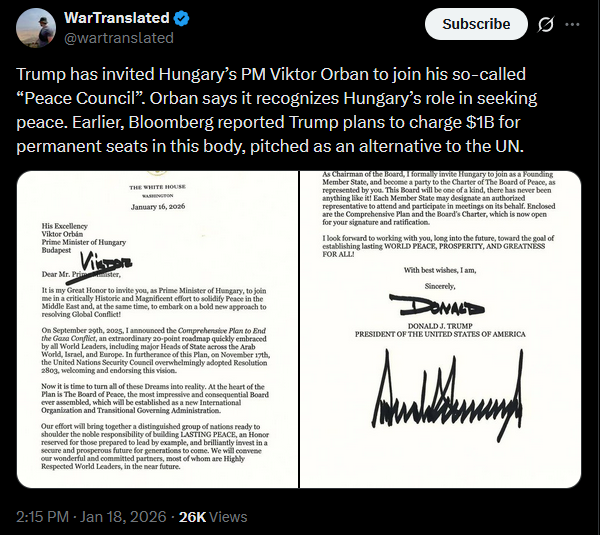 Trump has invited Hungary’s PM Viktor Orban to join his so-called “Peace Council”. Orban says it recognizes Hungary’s role in seeking peace. Earlier, Bloomberg reported Trump plans to charge $1B for permanent seats in this body, pitched as an alternative to the UN.https://x.com/wartranslated/status/2012891613157007507?s=20pic 1https://files.catbox.moe/ba8k7b.jpgpic 2https://files.catbox.moe/y32qme.jpg>>526352088 well the House should be the only body that's able to issue out Tariffs, the president shouldn't be doing that at time of non emergency, and Trump hasn't explained why greenland is a emergency to punish allies over for, that's the House's job