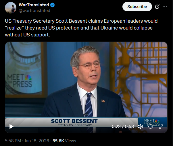 US Treasury Secretary Scott Bessent claims European leaders would “realize” they need US protection and that Ukraine would collapse without US support.https://x.com/wartranslated/status/2012947759989493883?s=20>5hhttps://files.catbox.moe/buvi4l.mp4