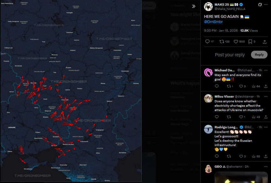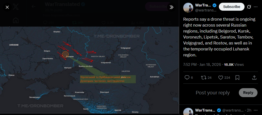 Reports say a drone threat is ongoing right now across several Russian regions, including Belgorod, Kursk, Voronezh, Lipetsk, Saratov, Tambov, Volgograd, and Rostov, as well as in the temporarily occupied Luhansk region.https://x.com/wartranslated/status/2012976505702236410?s=20>3h