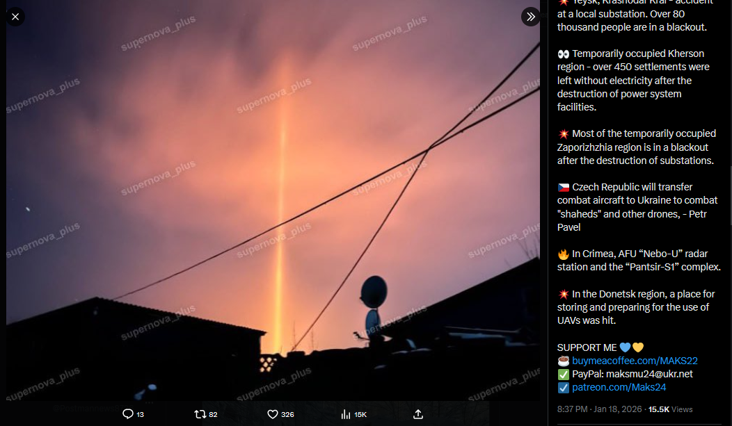 >>526354122>VERY BIG TOP NEWS TODAYMoscow region, Krasnozavodsk, sabotage at a substation. Blackout in the city. EU lawmakers are moving to halt the EU–US trade deal after Donald Trump threatened tariffs linked to Greenland, - Bloomberg Yeysk, Krasnodar Krai - accident at a local substation. Over 80 thousand people are in a blackout. Temporarily occupied Kherson region - over 450 settlements were left without electricity after the destruction of power system facilities. Most of the temporarily occupied Zaporizhzhia region is in a blackout after the destruction of substations. Czech Republic will transfer combat aircraft to Ukraine to combat "shaheds" and other drones, - Petr Pavel In Crimea, AFU “Nebo-U” radar station and the “Pantsir-S1” complex. In the Donetsk region, a place for storing and preparing for the use of UAVs was hit.>part 2