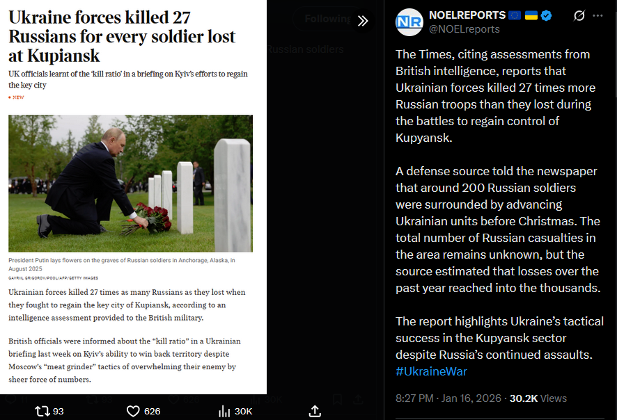 >>526356272>KupyanskThe Times, citing assessments from British intelligence, reports that Ukrainian forces killed 27 times more Russian troops than they lost 16-01-2026 Kupyansk