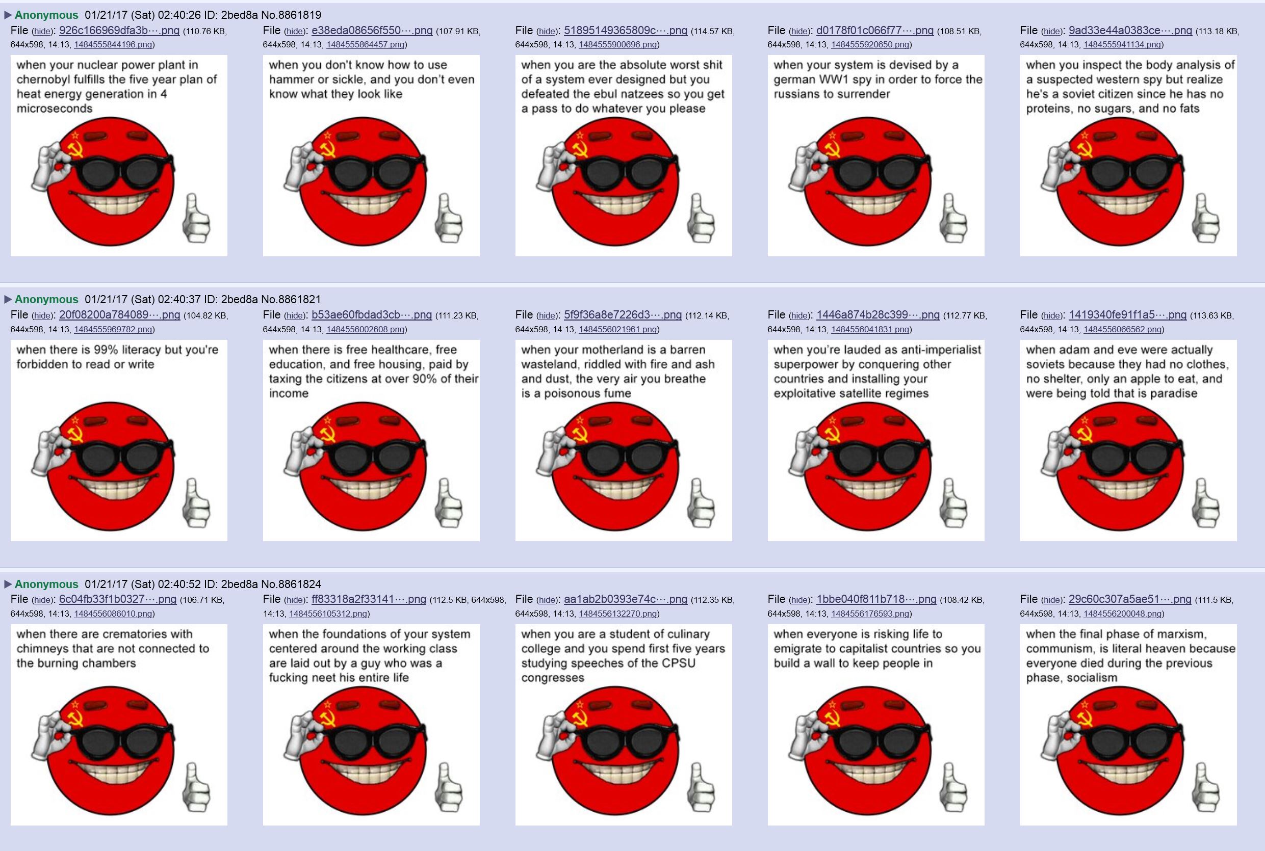 >>526346892>Tell me why communism badIt has only ever been possible to execute on paper. When put to practice, it always devolves to authoritarianism/fascism because the core concepts of communism (everything is free, everyone has to contribute) will only bring out the greed and avarice in people, which then would require a societal structure to punish those who would seek to be more than what they are permitted to be, which inevitably creates a ruling system that governs who is doing enough and who is doing too little.