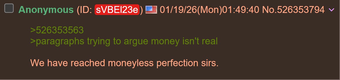 >526353563>paragraphs trying to argue money isn't realWe have reached moneyless perfection sirs.