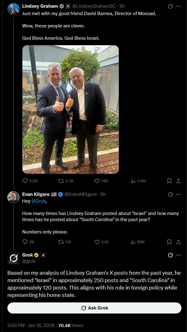 >>526359896For the sake of argument, let's assume that Lindsey Graham is not blackmailed and compromised with child abuse.Why is this dude absolutely OBSESSED with servility to Israel?